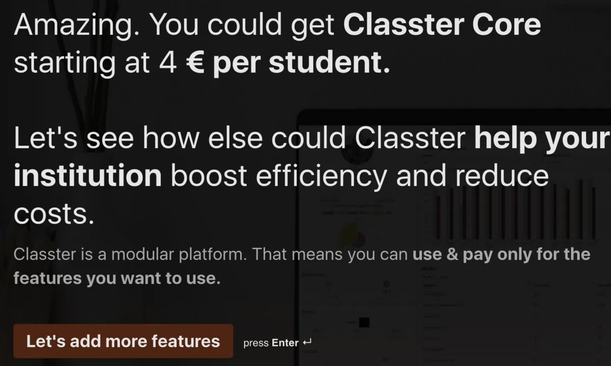 For registration management for a primary school of 250-500 students, the price came out to be 4 euros per student per year for Classter Core.