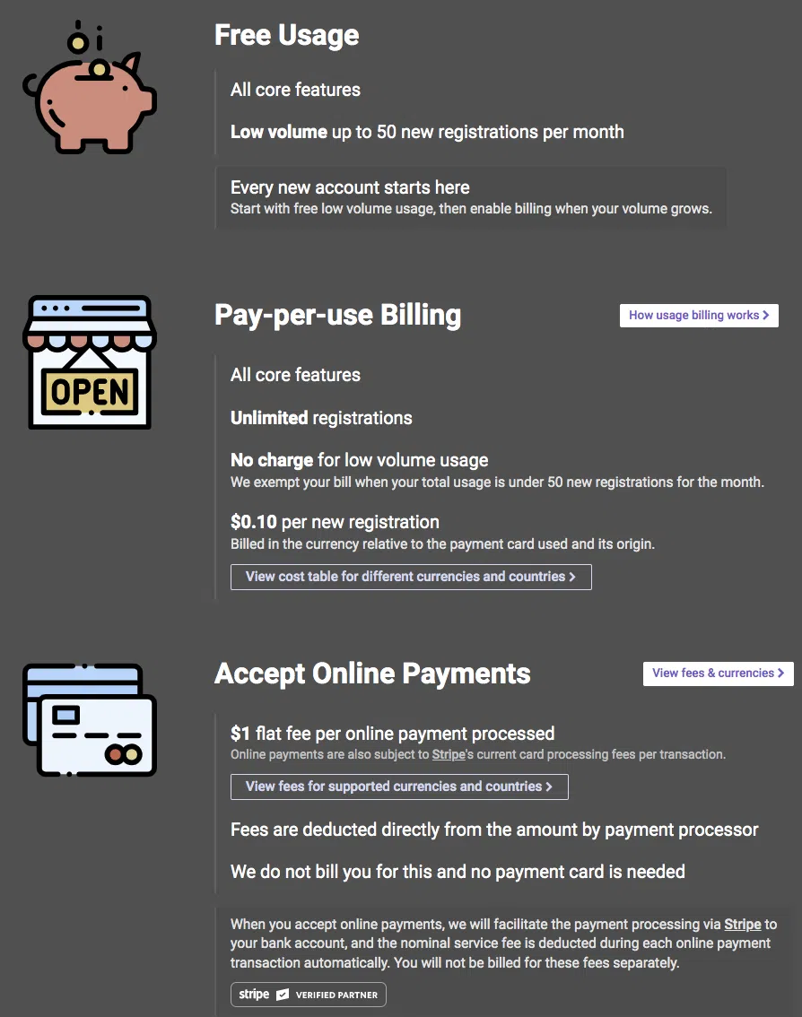Above that, the company offers usage-based pricing. You’ll pay 10 cents per every new registration, with no penalty for low registration numbers.