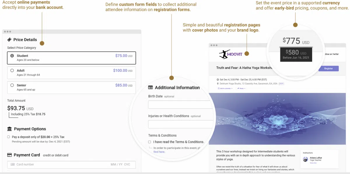 Other useful registration features include waiting lists, real-time updates for new registrations, and an integration with Google Analytics for tracking the performance of your online forms and event pages.