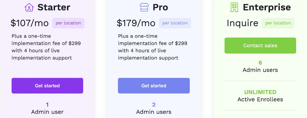 Pricing starts at $107 per month per location, plus a one-time charge of $299 for software implementation.