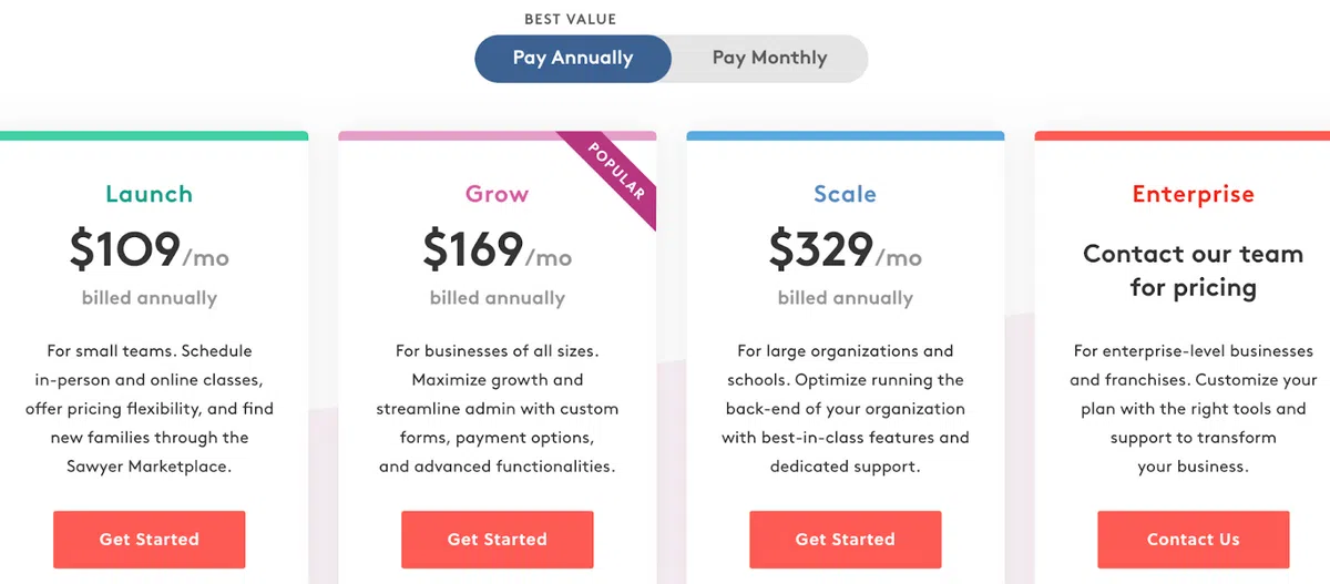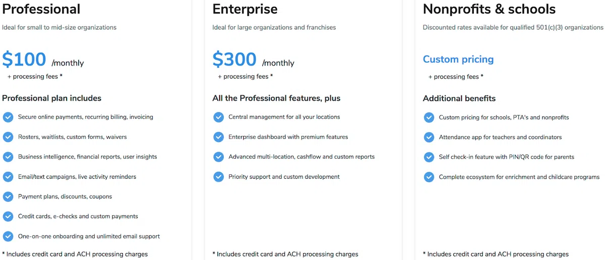 Pricing begins at $100 for the Professional plan, which includes many of the essential features for student registration and payment collection and is best suited for small to mid-sized businesses.