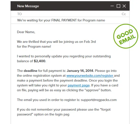 That means the software will auto-populate each email with relevant details about the campers and their parents, such as names, camp sessions, due dates, and specific payment information.