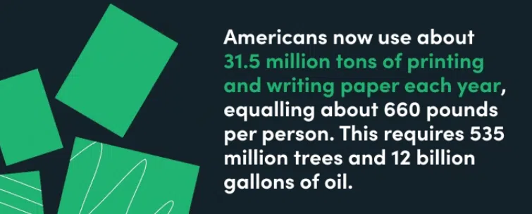 Moreover, Americans use about 31.5 million tons of printing and writing paper each year, which requires 535 million trees to be cut.