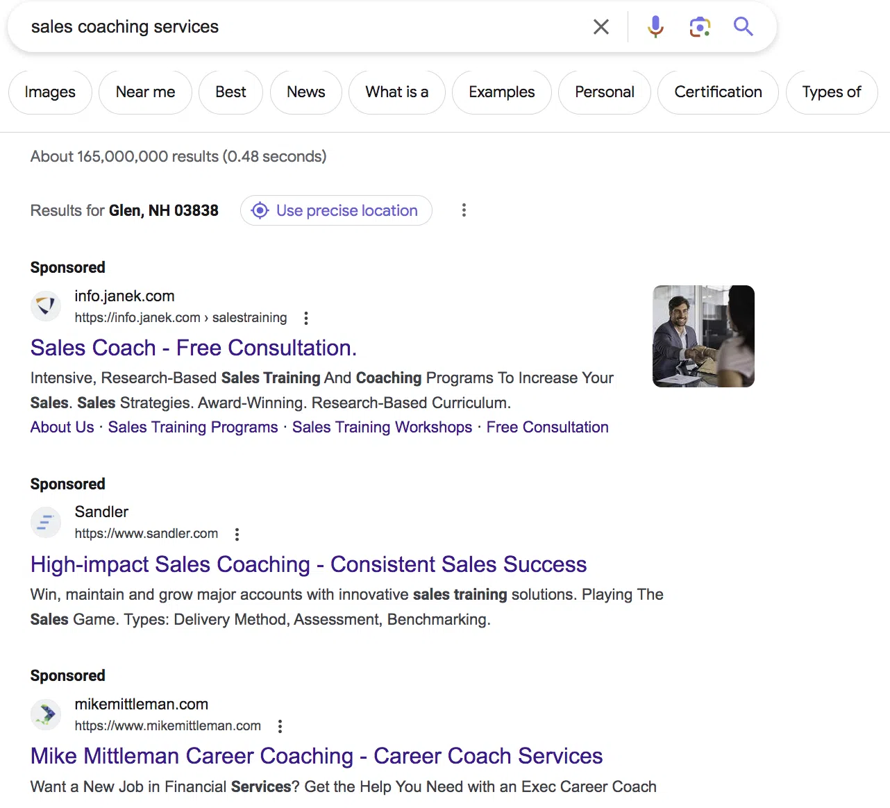 Here’s an example. When you type in “sales coaching services”, all these ads come up: