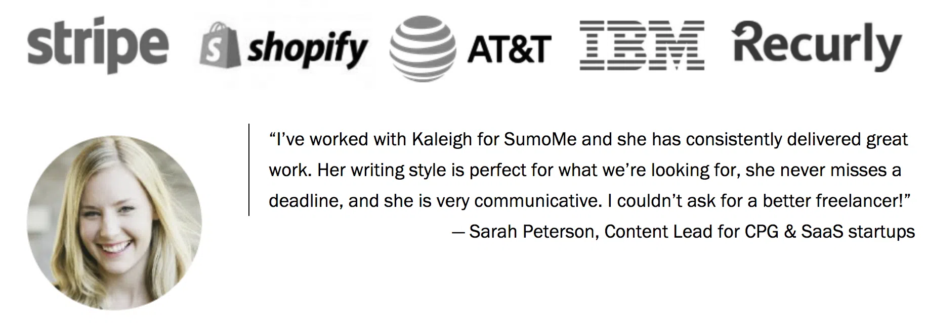 For example, underneath the logos of companies she’s helped, Kaleigh Moore, a freelance writer, shares this client testimonial: