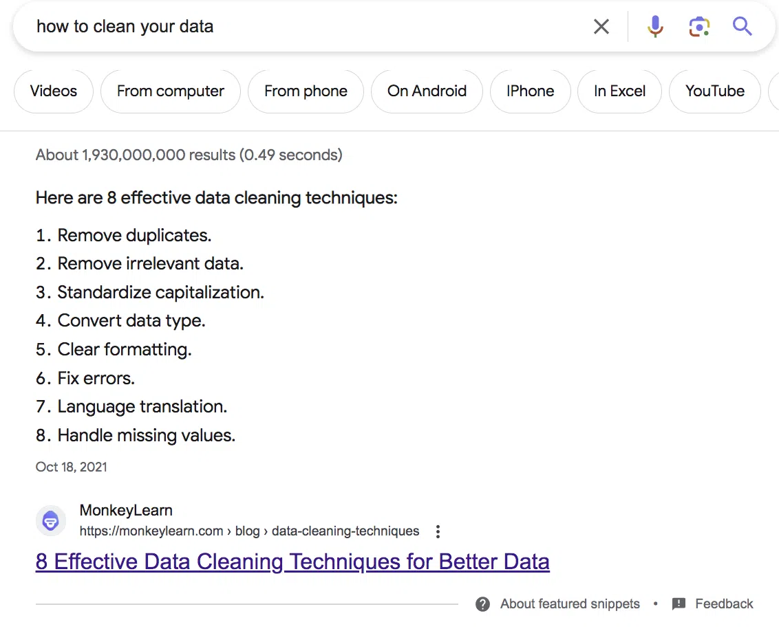 For example, MonkeyLearn, a data automation company, wrote an article covering data cleaning that ranks number one on Google when you search “how to clean your data”.
