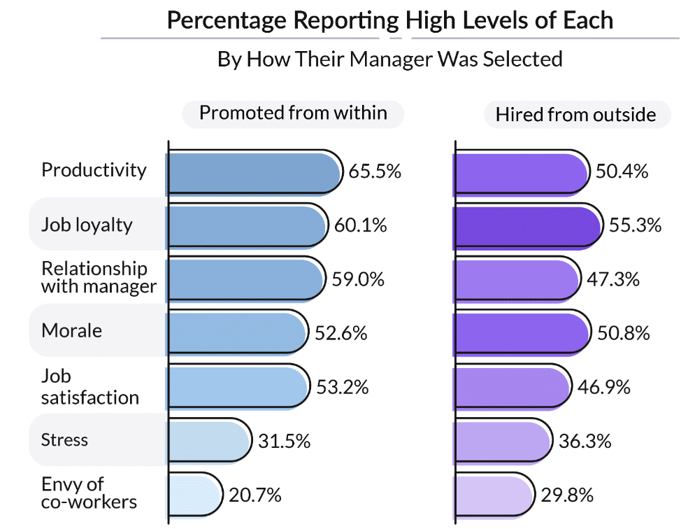 According to a survey from Joblist, around 2/3 of respondents believe that hiring from within is better than hiring externally, and 56% think that it’s better for morale.
