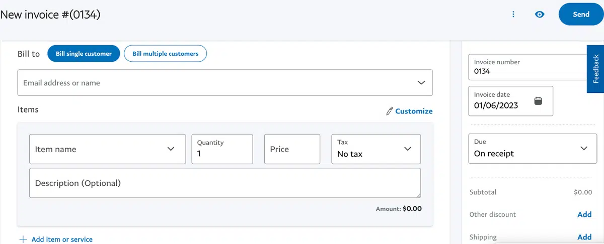 For example, in PayPal’s invoice creator, it takes about 10 seconds to create and send an invoice packed with all the information your customers need in order to pay you: