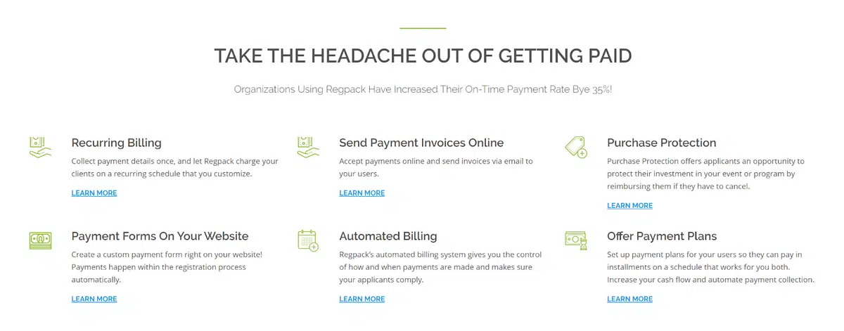 Online recurring billing software, like Regpack, also allows you to set up automated recurring invoices, so that, at a certain time each month or year, your invoices will be automatically created and sent out to your students.