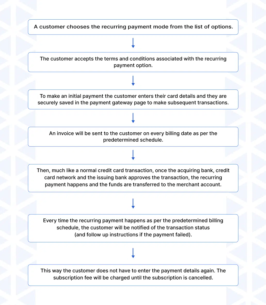Recurring billing enables you to automatically draw funds from consenting customers’ bank accounts at regular intervals, such as the 1st of every month.