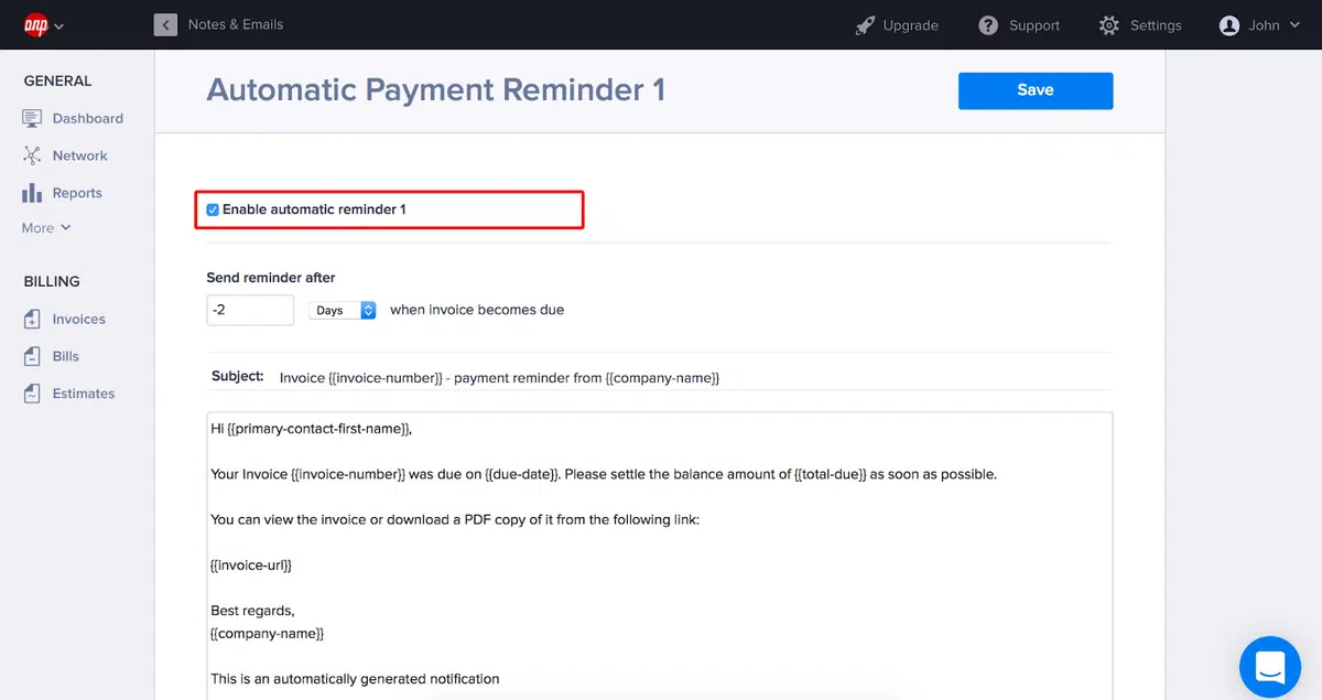 For example, here’s a template for a late email notice that goes out 2 days after the invoice is due, provided that the customer hasn’t paid:
