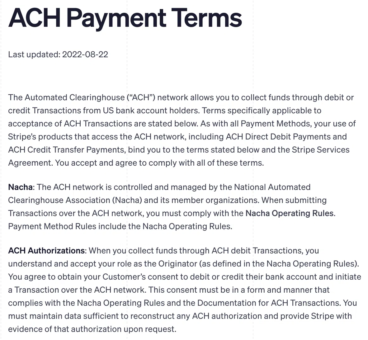 For example, here are some of Stripe’s terms for using their ACH payments: