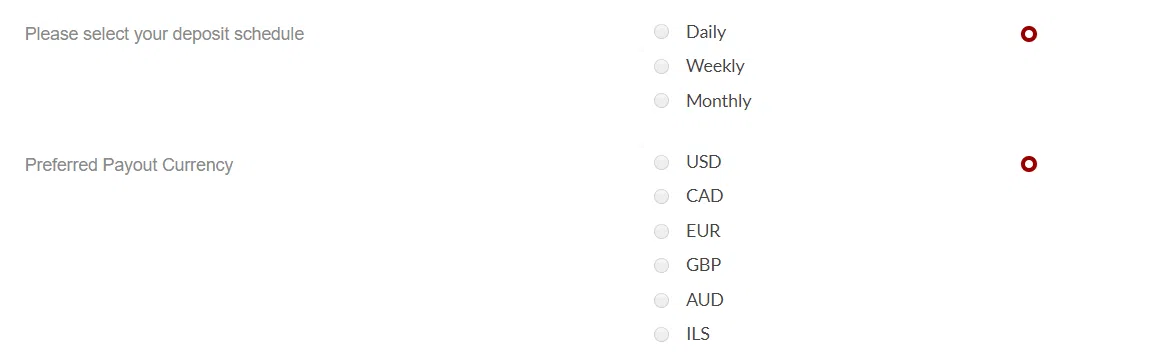 During the setup process, most tools will ask you to select your preferred deposit schedule and payout currency: