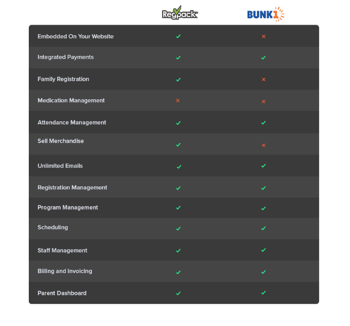 Regpack has many features Bunk1 doesn’t, like embedded registration and transparent pricing.