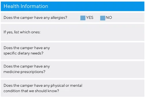 Seek insights about your camper’s medical history, encompassing prescriptions, allergies, chronic illnesses, dietary needs, and any pertinent physical or mental conditions.