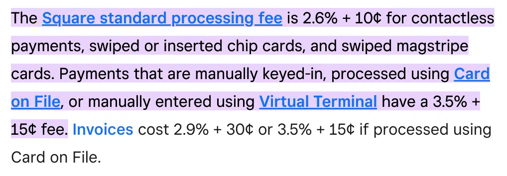 If your average sale was $10, and the flat rate was 3% + 20 cents interchange fees, you’d pay 50 cents per transaction.
