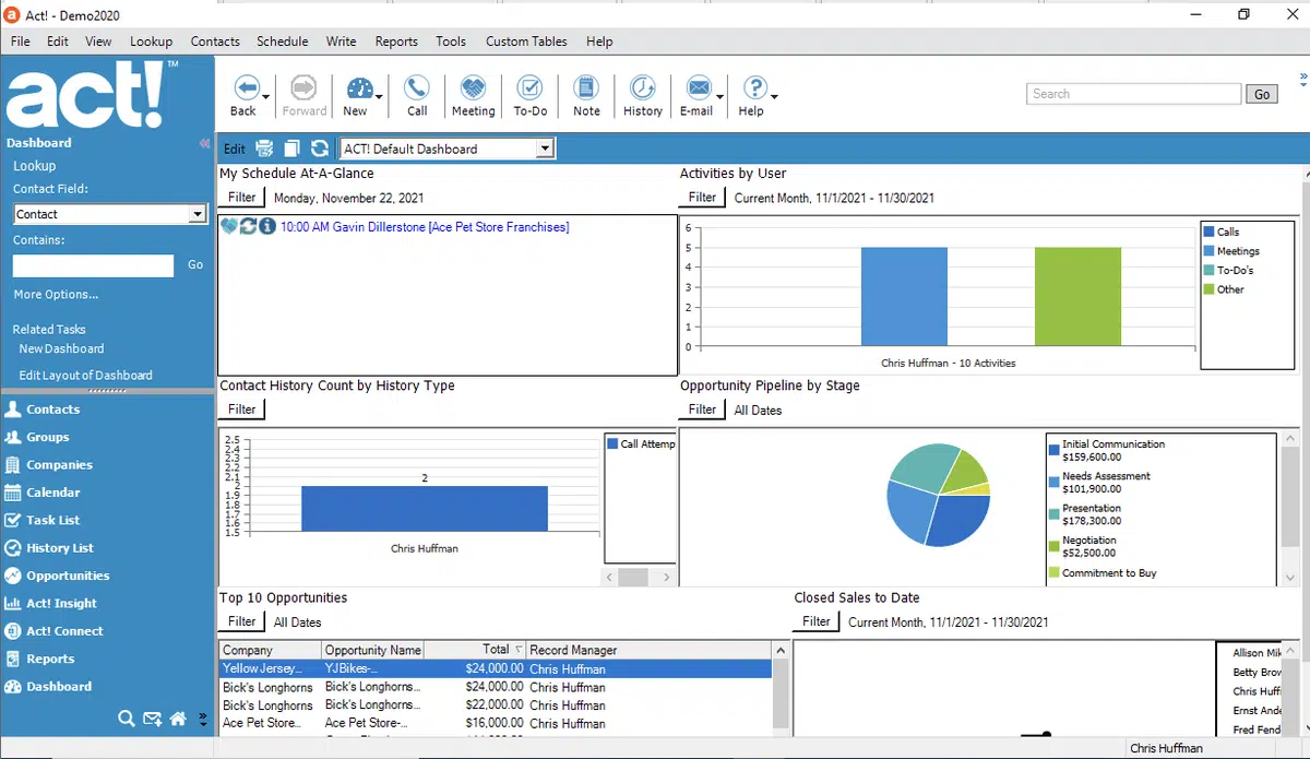 If you’re looking for an entry-level tool that lets you enter customer and prospect data easily, Act! CRM can get you off the ground running in a matter of minutes. You can also easily access a history of your client communications (such as calls, emails, and letters).