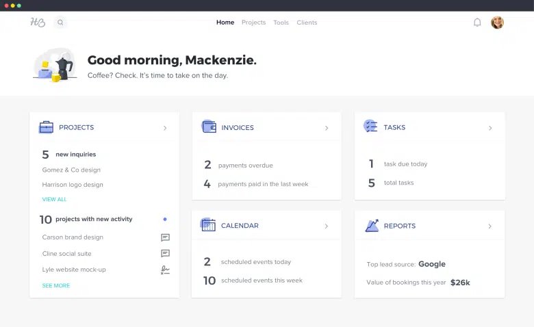 HoneyBook is an end-to-end client management tool that’s meant to help managers and business owners stay on top of every aspect of running their business.