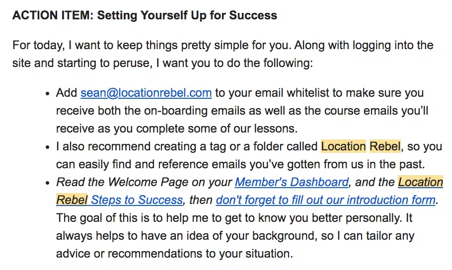 Some businesses include an Action Items section in their confirmation emails, as Location Rebel does below for their online course.