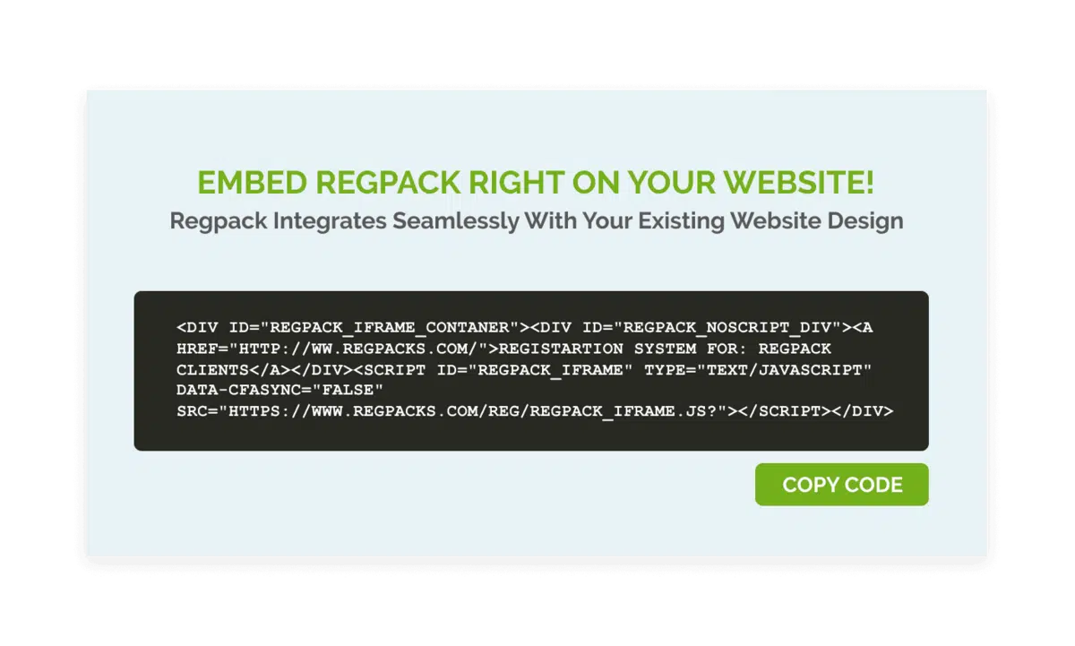 To create embedded online registration forms, use an online form builder tool. Most registration software, including Regpack, comes with this easy-to-use feature: