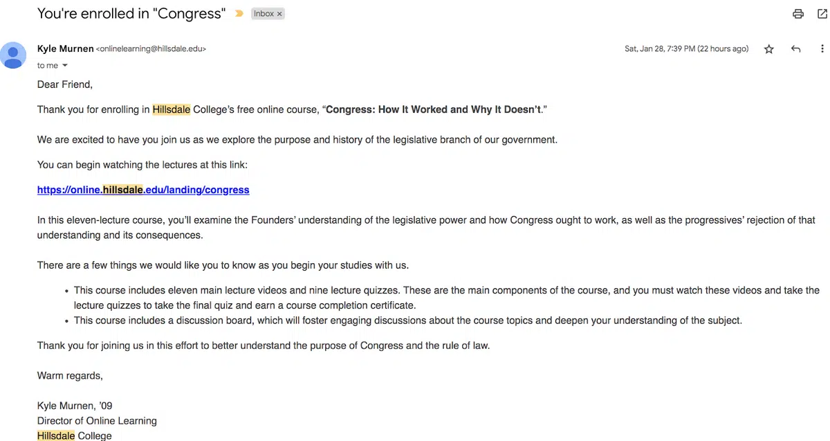 To do this, they’ll often include a link that students can click to navigate to the beginning of the course, as Hillsdale has done below in their confirmation email: