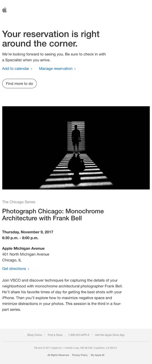 One look at this confirmation email makes it clear that the event revolves around photography, and this is thanks to the black-and-white photo that immediately captures the recipient’s attention.