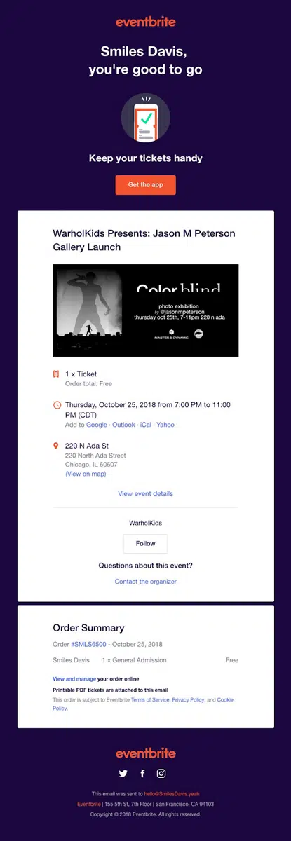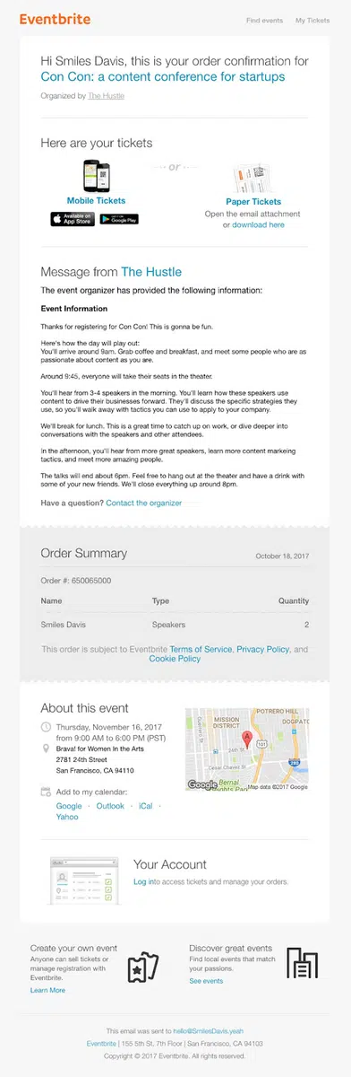 Eventbrite’s event registration confirmation email does a great job of relaying important information like the event name, ticket price, event date, and location, while also assuring the attendee that their payment went through.