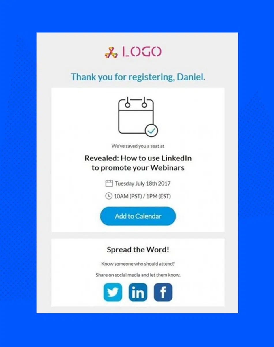 Logo’s webinar confirmation email uses a simple and clean layout that highlights only the most relevant event information, including the purchase confirmation, the webinar’s title, and its date and time.