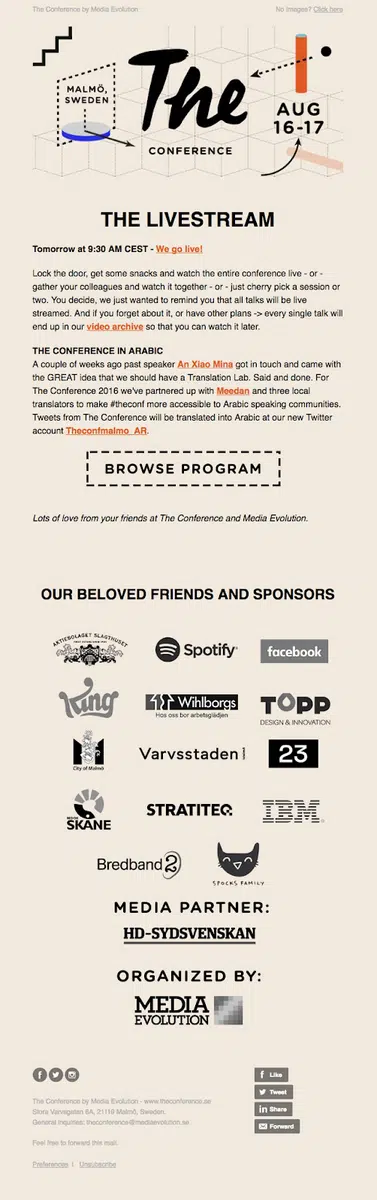 Lastly, the email gives attendees the option to browse the program and learn more about the event’s sponsors.