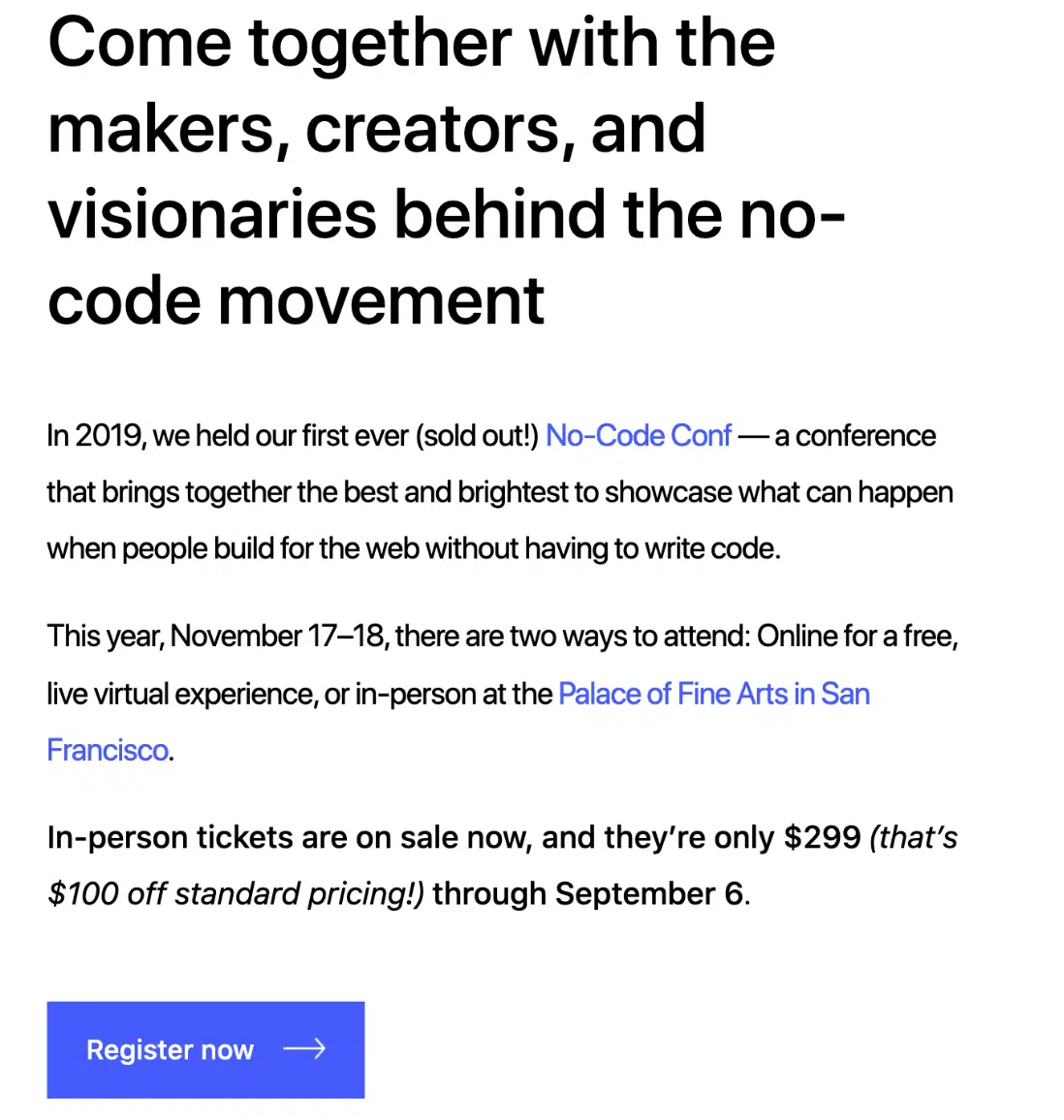And here’s another email for a conference about no-code technology. This one highlights the limited time to get low-priced tickets as the main reason to register ASAP.