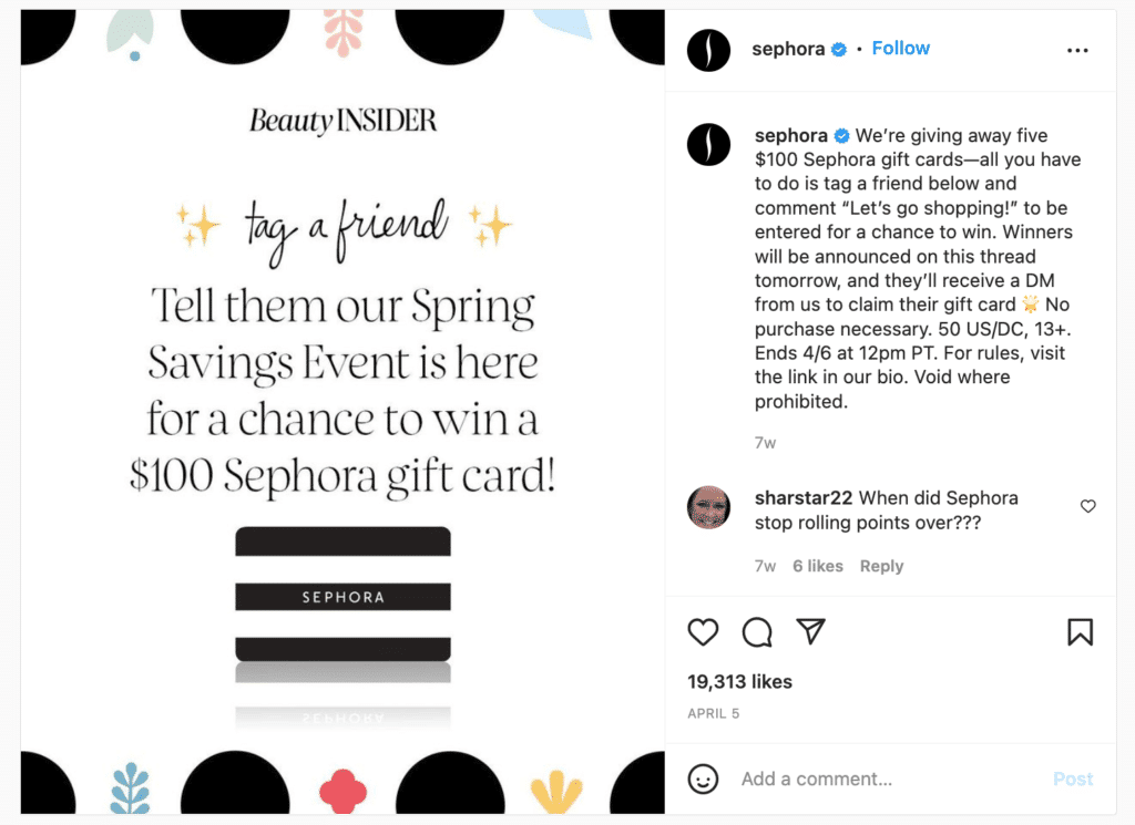 Here’s an example of a company encouraging its followers to tag friends for a chance at a $100 gift card at their Spring Savings Event: