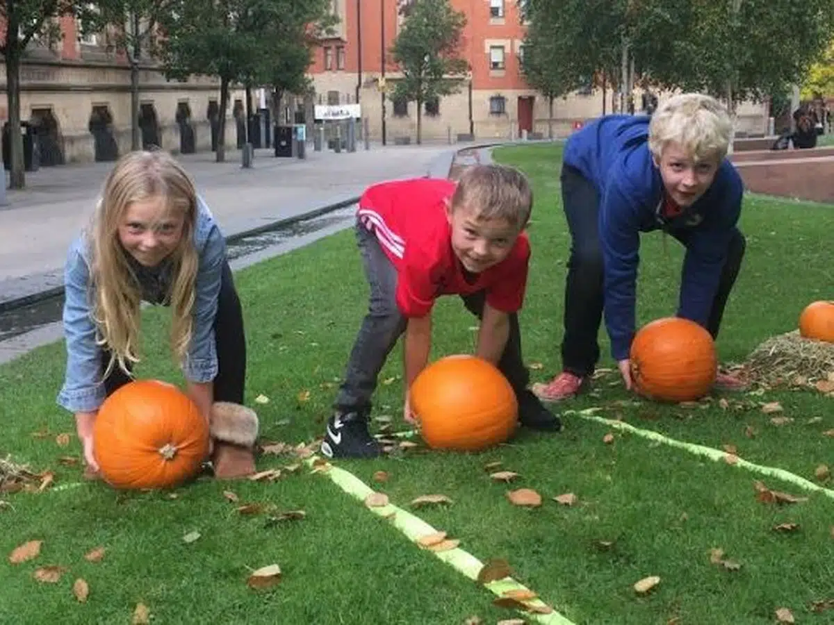 The concept is simple—children roll pumpkins to a finish line you’ve marked with either chalk, string, two cones, or anything that’ll make a distinctive line.