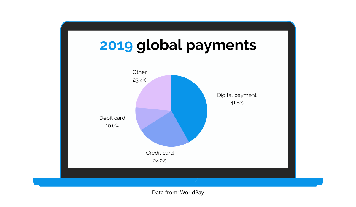 You may not think your customers would prefer this type of payment, but statistics prove otherwise. Worldpay analyzed 2019 global e-commerce payment methods and found that digital payments or mobile wallets made up for most online transactions at 41.8%.