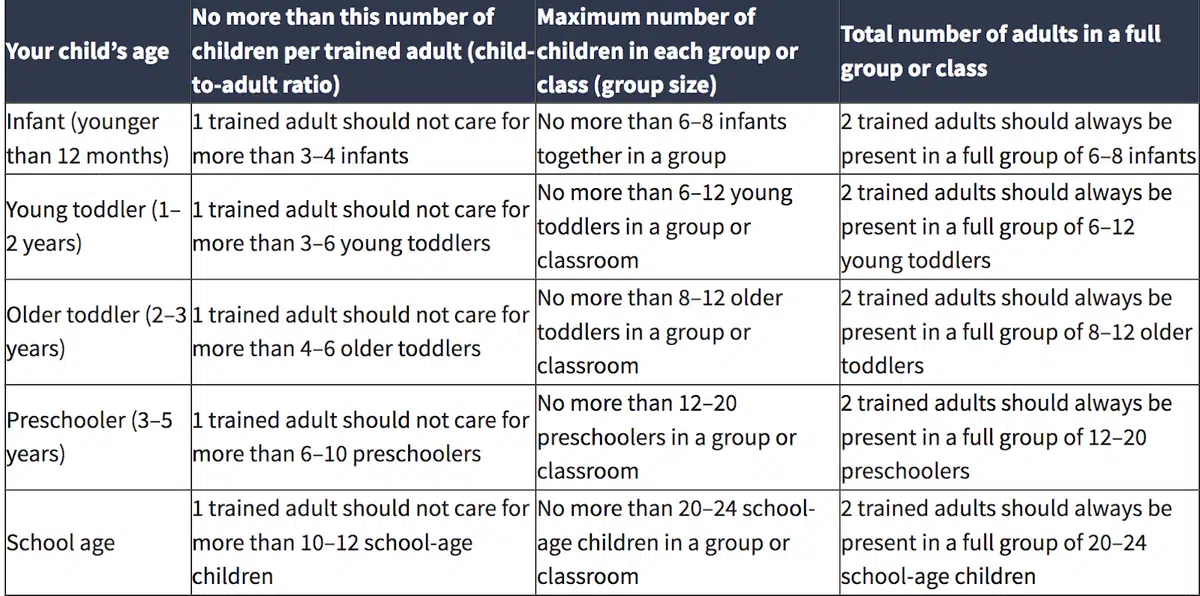Here’s a helpful table from ChildCare.gov to figure out what your group sizes should be: