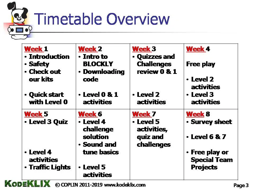 For example, here’s a calendar from an after-school coding program outlining eight weeks of the curriculum: