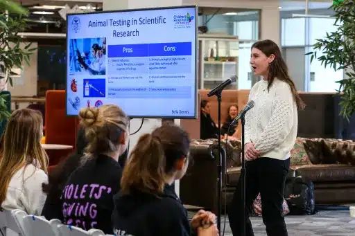 For example, here’s a guest speaker giving a presentation about animal testing in scientific research:
