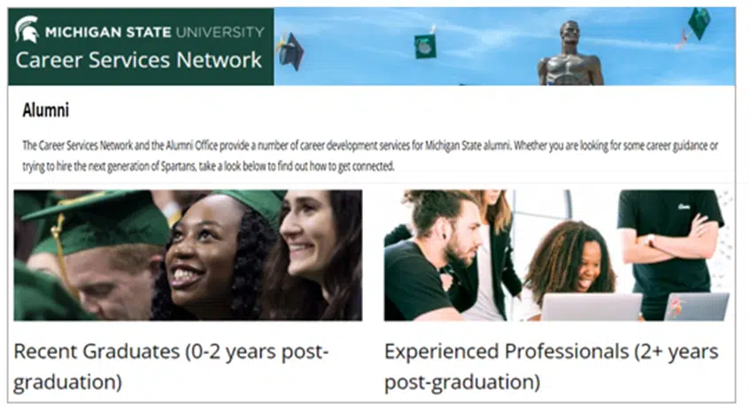 For instance, graduates might be interested in how they can create a great CV and cover letter or how to take advantage of professional networking opportunities through the alumni career support network, like the one shown here.