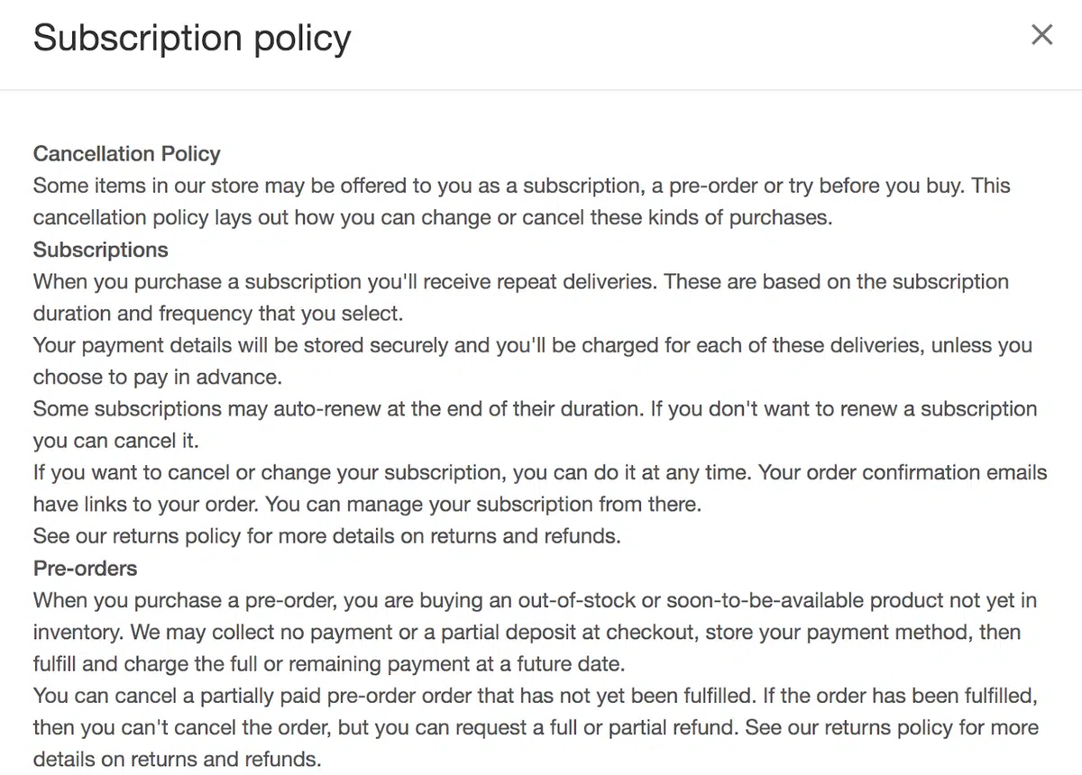 When shoppers click on it, it expands into a popup box where the customer can read policies regarding cancellation, pre-orders, subscription, and generally, try before they buy: