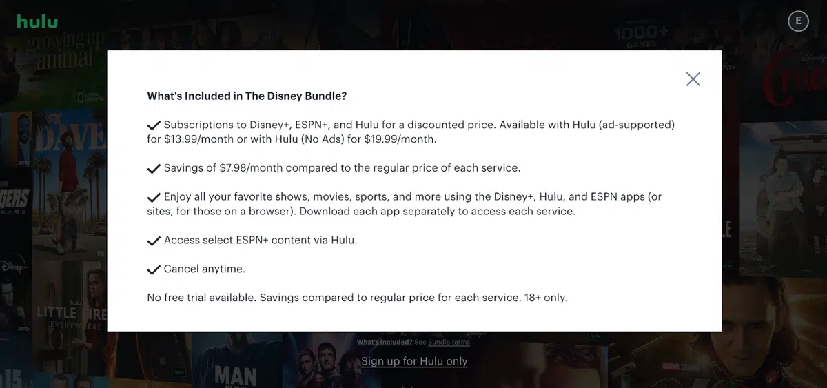 Other companies, like Hulu, share the most important policy information, like free cancellation and price per month, on their homepage: