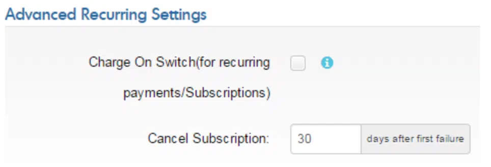 Below, you’ll see the business chose to have the tool cancel the subscription 30 days after the first failed attempt: