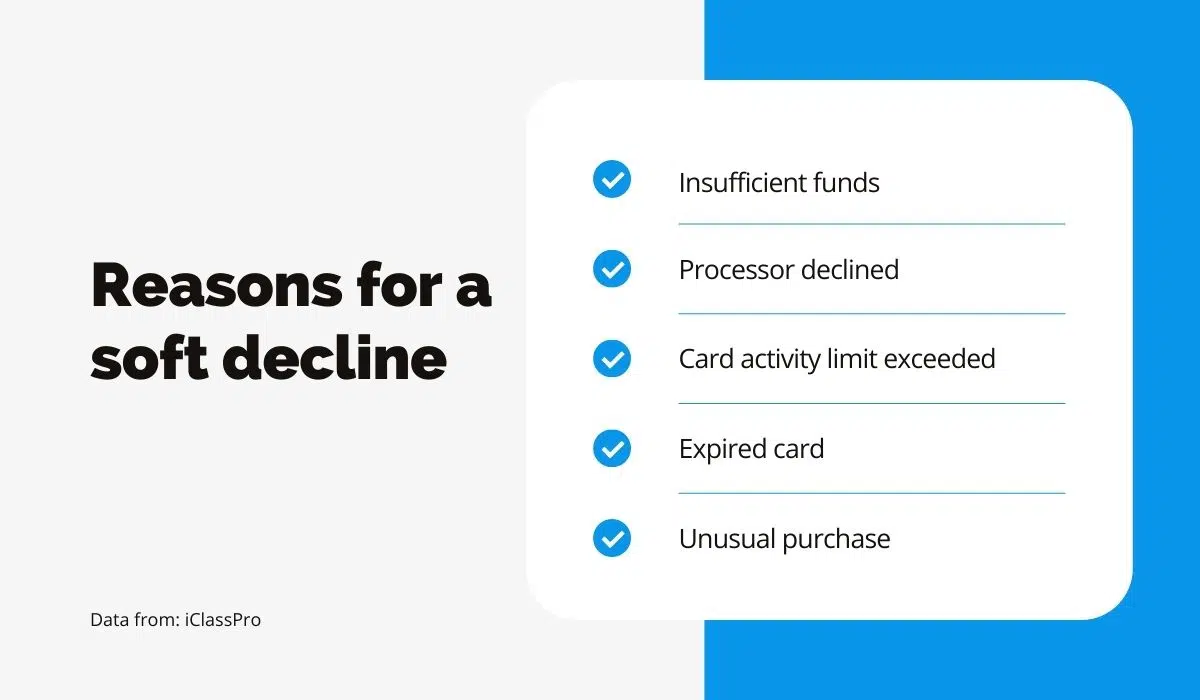 Some examples of reasons for a soft decline are insufficient funds, a generic error, or a temporary hold on the account or card.