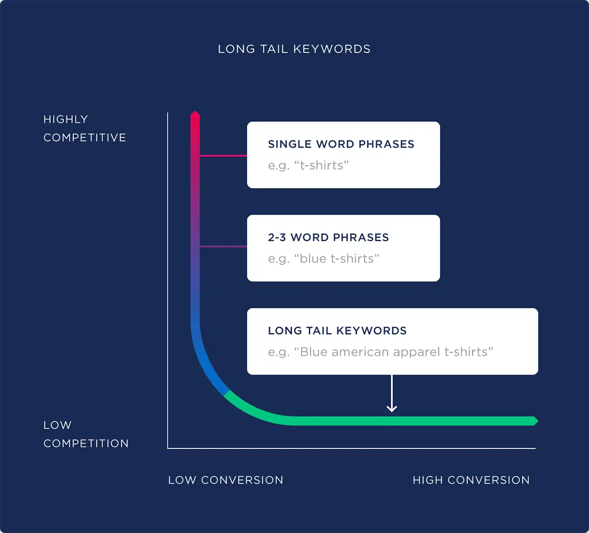 Note that it’ll be easier for you to rank for longer phrases (long-tail keywords) than for the more competitive one- or two-word phrases, as demonstrated below.