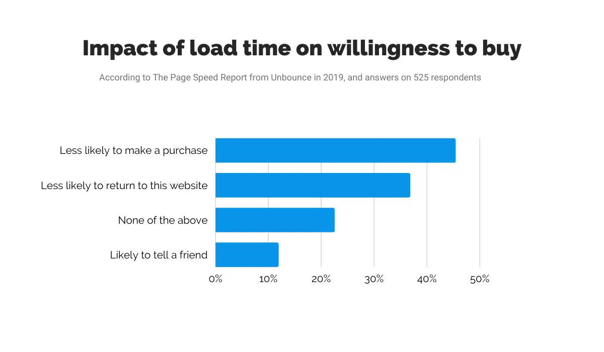 To do this, start by ensuring your page speed is up to par. According to Forbes, 70% of consumers say page speed influences their willingness to buy. The chart below shows just a part of the survey on this topic.