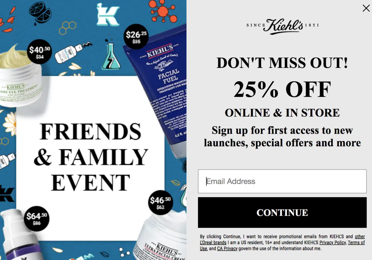 As for how to offer the discount to site visitors, consider using a pop-up box or web form that collects a visitor’s email address in return for a discount, which will be applied at checkout, as Kiehl’s has done on their site: