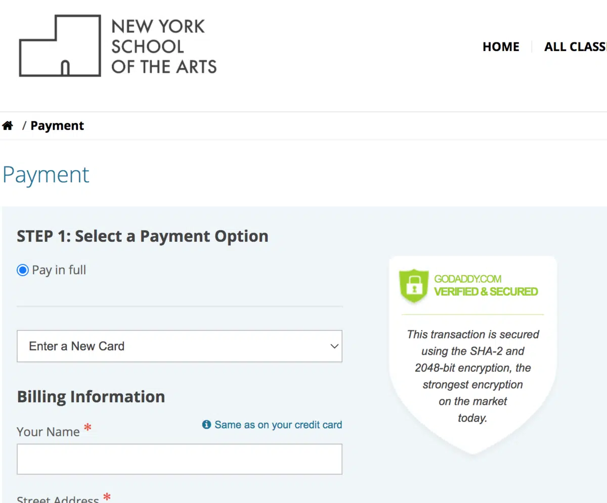 In light of recent data breaches and the public’s prioritization of data protection, It’s also a good idea to highlight any data security functionality in your checkout, as the New York School of the Arts has done on the purchasing page for one of their programs: