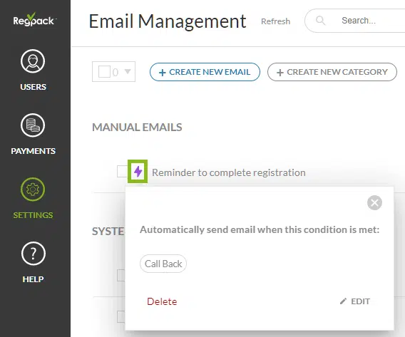 Here’s an example of Regpack’s email feature, which enables you to set up automation options that will send emails to specific customers when a certain condition is met: