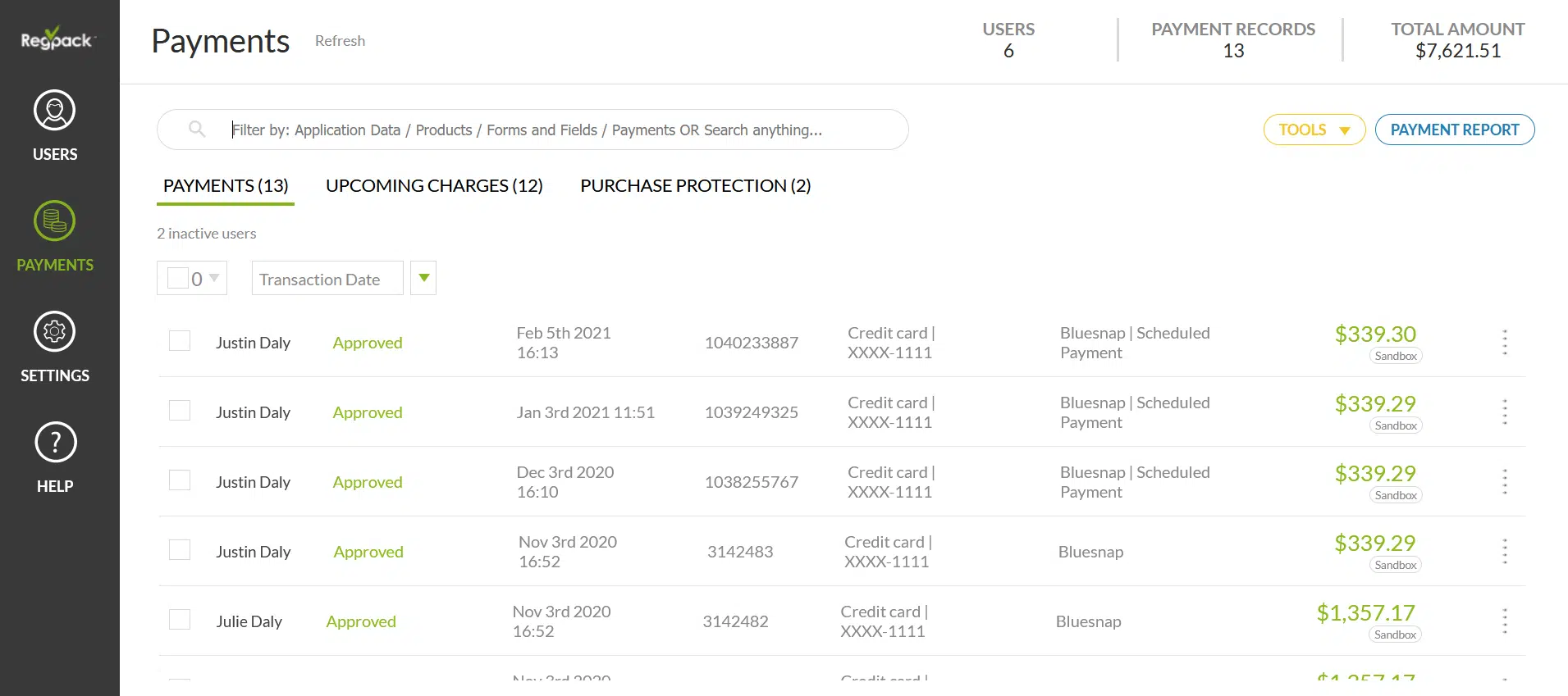 With an integrated payment software solution like Regpack, which comes with dozens of filters, you can view the entire payment history of a specific customer, a segment of customers, a specific service, a payment method, and other categories.
