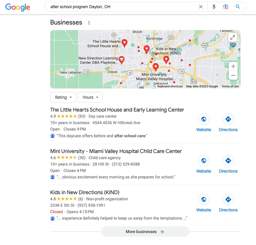 When searching for an after-school program, most parents turn to Google. They might search for “after school program Dayton” or “daycare after school near me”.