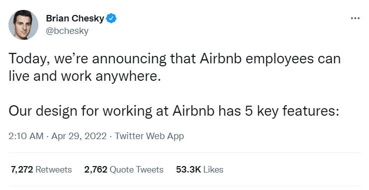 And while some large companies rejected the idea, in late April 2022, Airbnb CEO Brian Chesky announced that Airbnb employees would be able to work from home permanently.