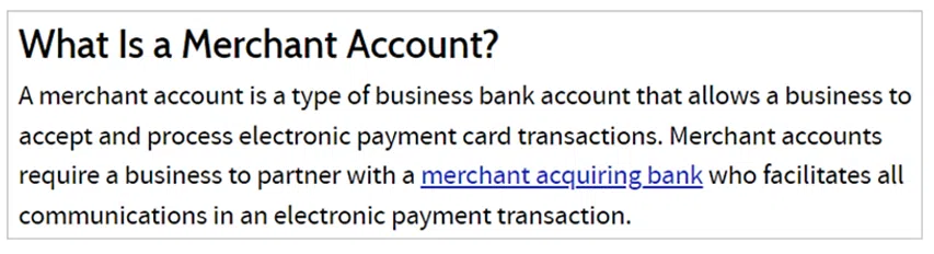 In simple terms, a merchant account is a pass-through account used for electronic online payments where the acquiring bank places the funds your customer pays and holds them typically for one to three business days for security and processing purposes.